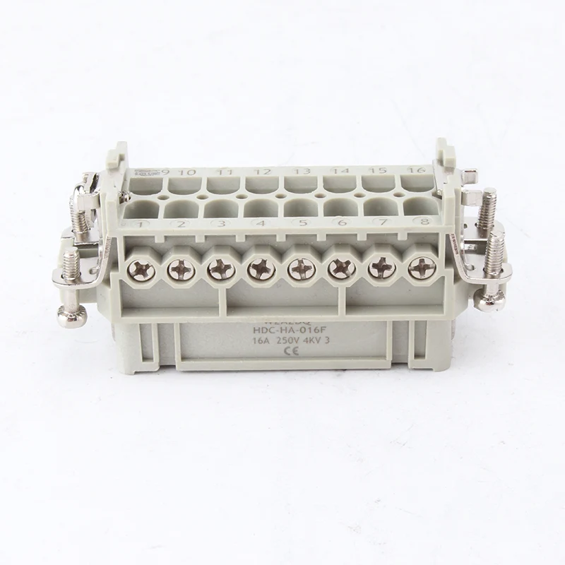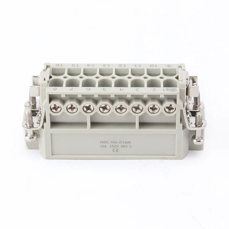 16A 10 Pin Insert Heavy Duty Connectors ແມ່ນພາກສ່ວນ inert ເພດຍິງ ແລະເພດຊາຍ. HA-016-M ແລະ HA-016-F ແມ່ນເພດຊາຍແລະເພດຍິງ, ພວກມັນຖືກຈັບຄູ່ກັນເປັນຊຸດ. ພວກເຂົາກໍາລັງເຮັດວຽກຮ່ວມກັນກັບເຮືອນອາລູມິນຽມຂອງ H16A. ອົງປະກອບຂອງຕົວສຽບແລະທີ່ຢູ່ອາໄສພາຍນອກຮ່ວມກັນປະກອບເປັນຜະລິດຕະພັນເຊື່ອມຕໍ່ທີ່ສົມບູນ. ພວກມັນແມ່ນເຮັດດ້ວຍແກະ PC ແລະ pins ທອງເຫລືອງທີ່ມີແຜ່ນເງິນ. pins plated ເງິນເຮັດໃຫ້ມັນເຊື່ອມຕໍ່ໄຟຟ້າໄດ້ດີ.